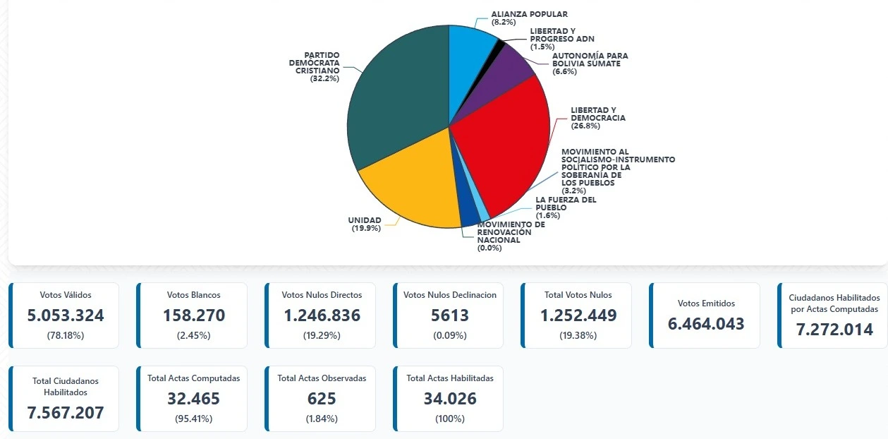 Por otra parte, el conteo oficial del ente electoral aún continúa su proceso. Hasta las 12:00 de este lunes, se computaron el 27.03% de las actas. Puede ingresar a este enlace para seguir el cómputo https://computo.oep.org.bo/.