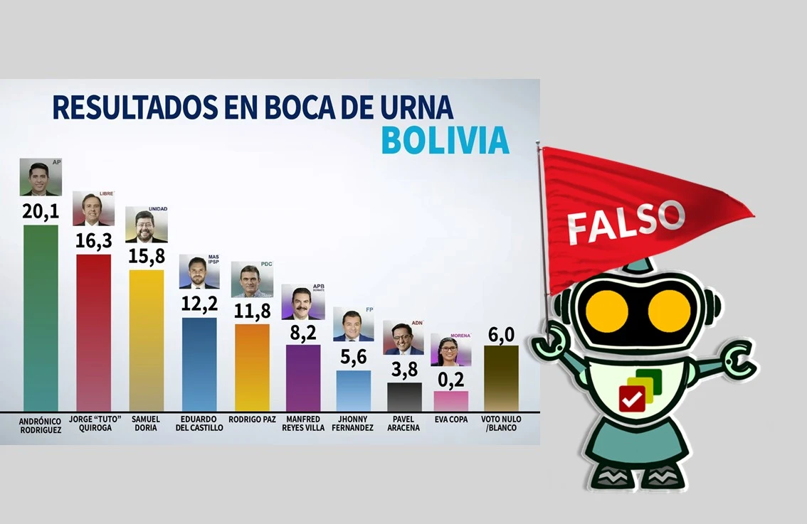 En Facebook circula una imagen que presenta unos resultados en «boca de urna» de las elecciones del domingo 17 de agosto. En ella, se atribuye la victoria al candidato de la Alianza Popular, Andrónico Rodríguez, con un 20,1%, seguido de Jorge Tuto Quiroga, de Alianza Libre, con 16,3%. Sin embargo, es completamente falsa.