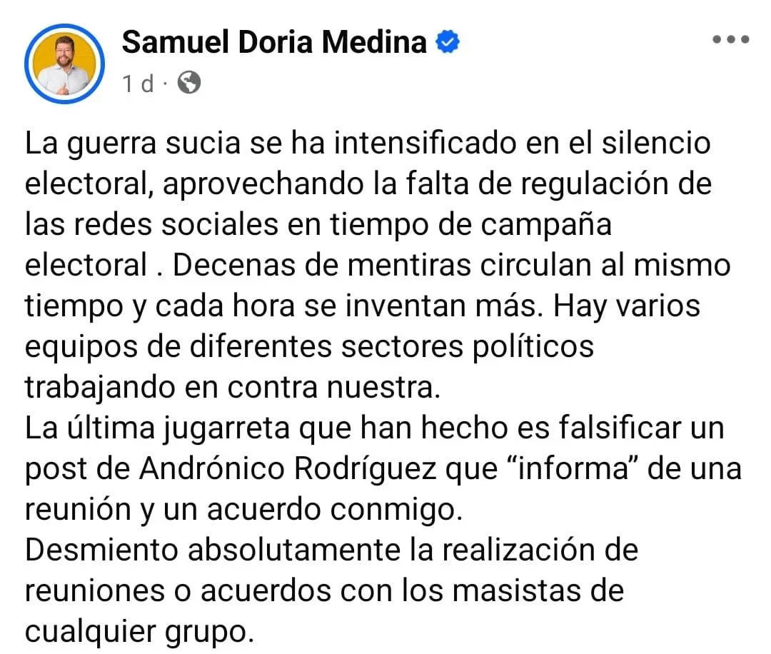 Al respecto, Doria Medina también se pronunció a través de sus redes sociales y desmintió la realización de reuniones o acuerdos.