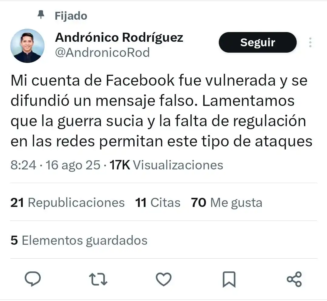 El mensaje sí fue publicado en el perfil de Rodríguez, pero fue borrado minutos después. Por esa razón, el candidato a la presidencia advirtió a través de X que su cuenta de Facebook habría sido vulnerada y difundió un mensaje falso.