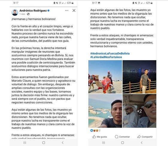 «(…) En las próximas horas, la derecha intentará manipular imágenes de reuniones que sostuvimos siempre pensando en Bolivia. Sí, nos reunimos con Samuel Doria Medina para evaluar una posible coalición de centroizquierda. También sostuvimos diálogos internacionales para buscar soluciones para nuestra patria.