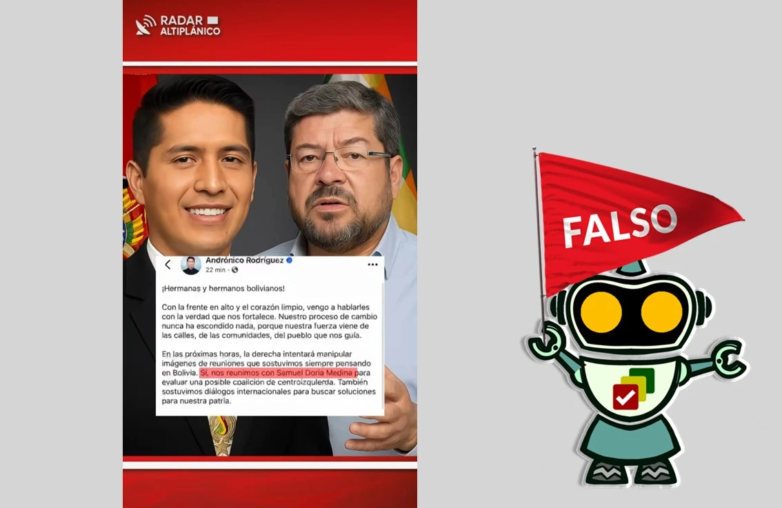 A través de TikTok se comparte un video en el que se afirma que Andrónico Rodríguez, candidato por Alianza Popular, se habría reunido con el presidenciable Samuel Doria Medina de la Alianza Unidad) tras una gestión del empresario boliviano Marcelo Claure. No obstante, este mensaje es falso. Rodríguez alertó que su cuenta en Facebook fue hackeada y que él no hizo dicha publicación donde anuncia el encuentro.