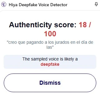 El contenido fue sometido a una herramienta de detección de voz sintética. El resultado indicó una baja probabilidad de autenticidad (18%), lo que refuerza los indicios de manipulación.
