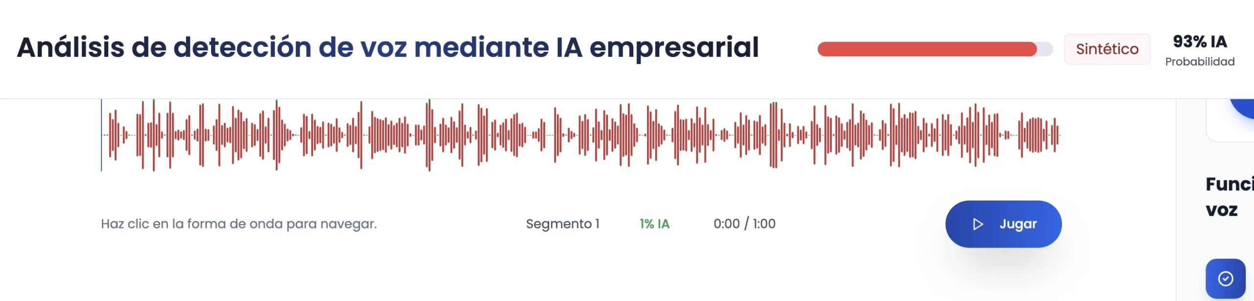 El análisis de detección de voz mediante inteligencia artificial arroja un resultado contundente: el audio presenta una probabilidad del 93% de haber sido generado por IA, siendo además clasificado como “sintético”. Este nivel de certeza, según la herramienta utilizada, indica una alta coincidencia con patrones característicos de voces artificiales, lo que refuerza la hipótesis de que no se trata de un registro auténtico de una persona real.