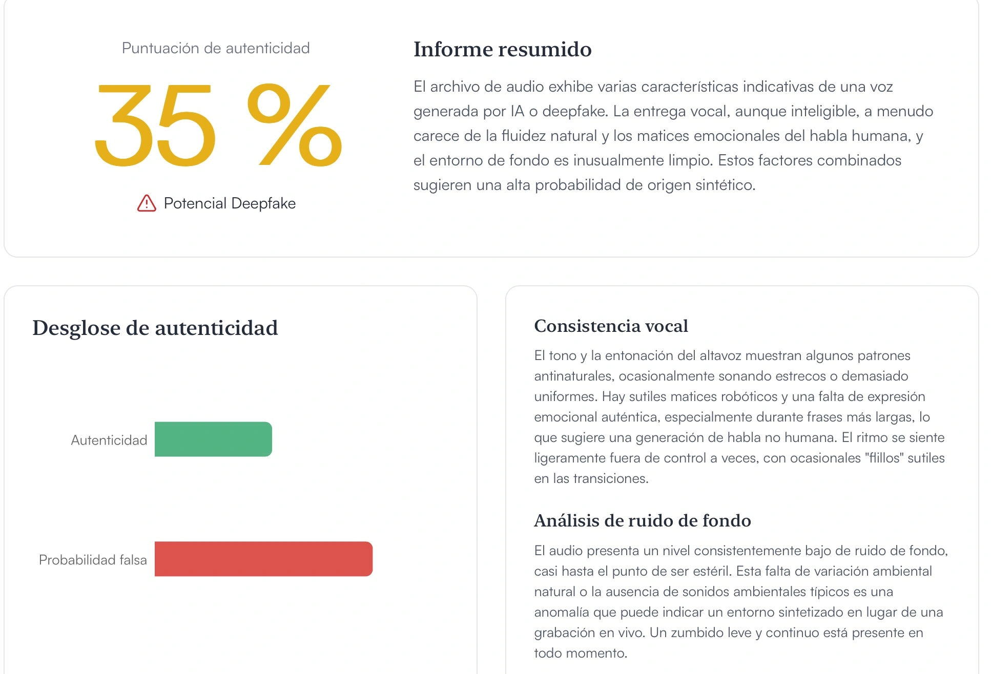 El análisis de autenticidad del audio arroja una puntuación del 35%, acompañado de la advertencia de “potencial deepfake”, lo que indica que el contenido presenta señales compatibles con generación o manipulación mediante inteligencia artificial. El informe técnico señala que, si bien la voz es inteligible, carece de fluidez natural y de los matices emocionales propios del habla humana, elementos que suelen ser determinantes en la identificación de contenidos sintéticos.