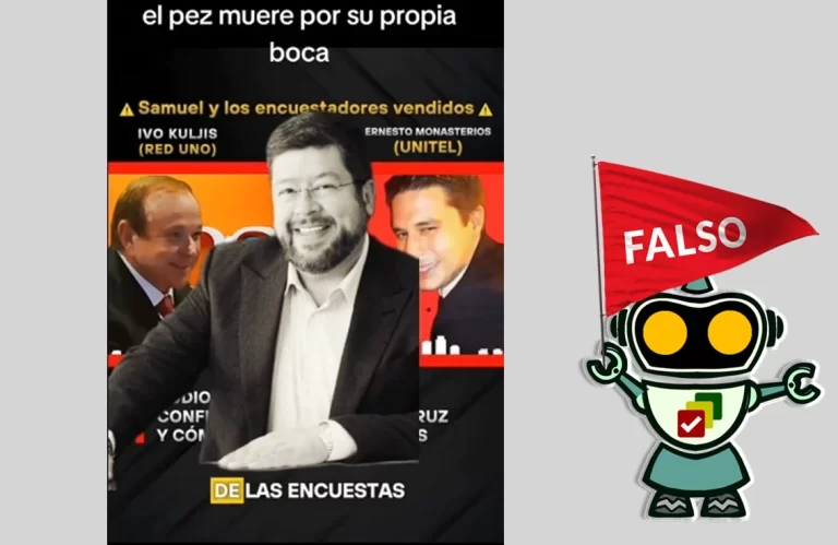 La voz del empresario carece de naturalidad y según herramientas de análisis especializado, el audio fue simulado con inteligencia artificial. El equipo de Bolivia Verfica también sometió el video a un estudio técnico. Por TikTok se difunden dos videos donde el candidato presidencial de la Alianza Unidad Samuel Doria Medina afirma que le pidieron «medio … Sigue leyendo Audio en el que Samuel Doria Medina dice que le piden medio millón para manipular encuestas es falso