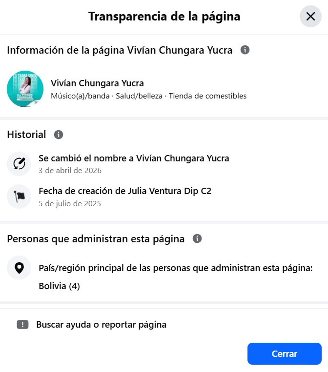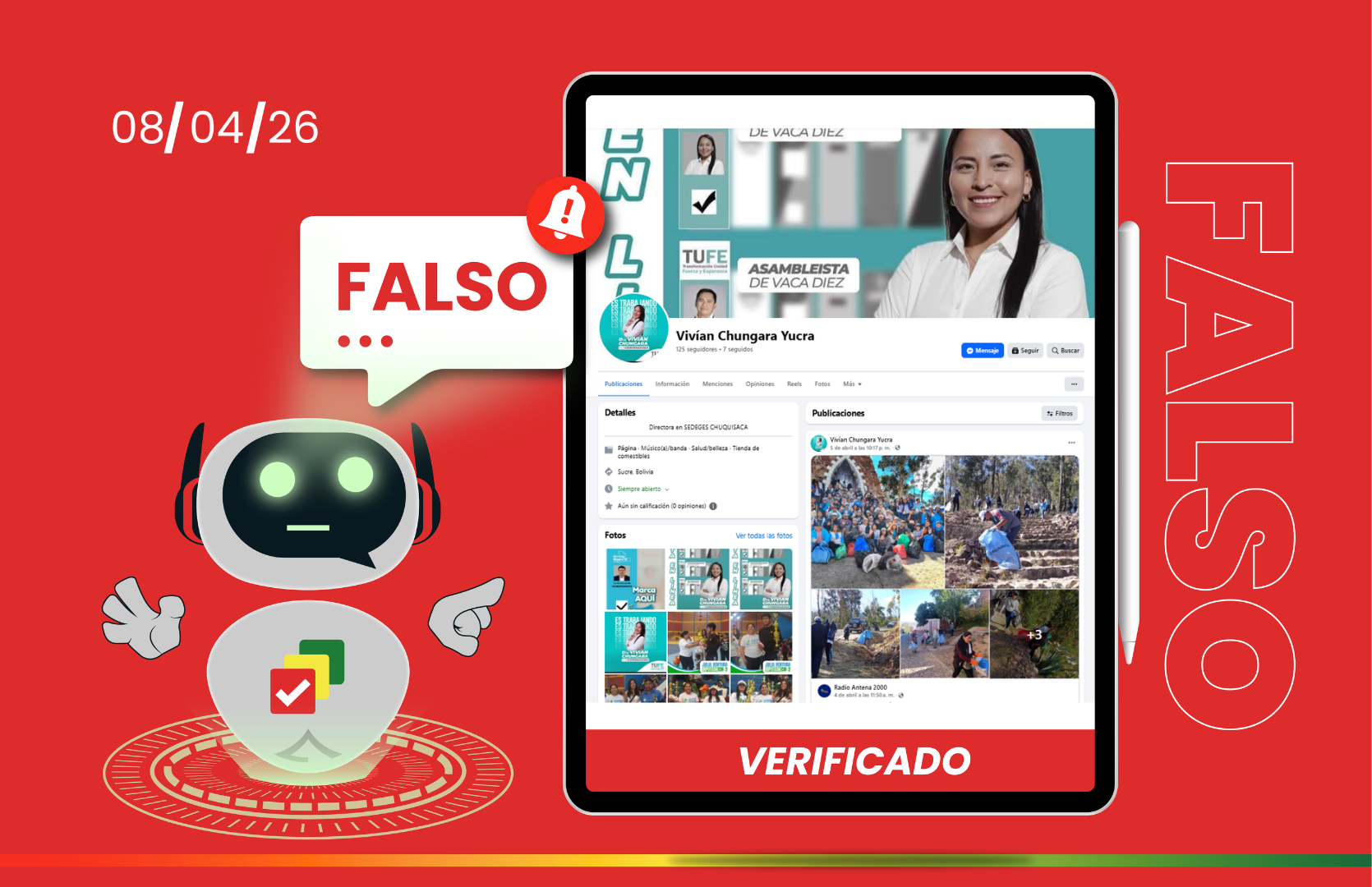 La exdirectora de la Gobernación de Chuquisaca no está apoyando al Luis Ayllon; ese perfil es falso https://boliviaverificaelecciones.bo/la-exdirectora-de-la-gobernacion-de-chuquisaca-no-esta-apoyando-al-luis-ayllon-ese-perfil-es-falso/ Wed, 08 Apr 2026 14:43:54 +0000 https://boliviaverificaelecciones.bo/?p=15442 La cuenta lleva el registro principal de una excandidata por la circunscripción 2 de la Alianza Popular, agrupación de Andrónico Rodríguez. Redacción: Adriana Olivera En Facebook, circula un perfil a nombre de Vivian Chungara, exsecretaria de la Gobernación de Chuquisaca y exdirectora del Servicio Departamental de Gestión Social (SEDEGES), mediante el cual se difunden contenidos […]