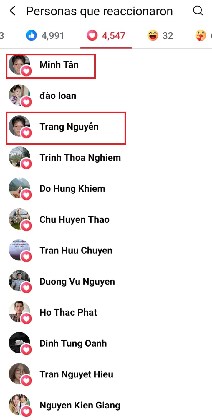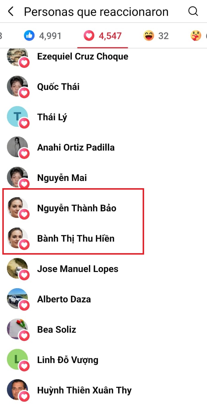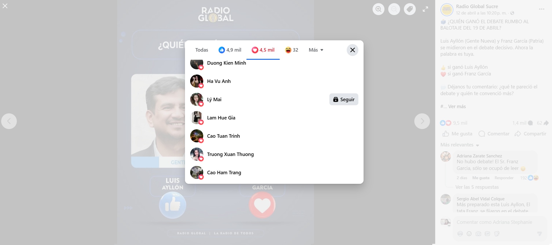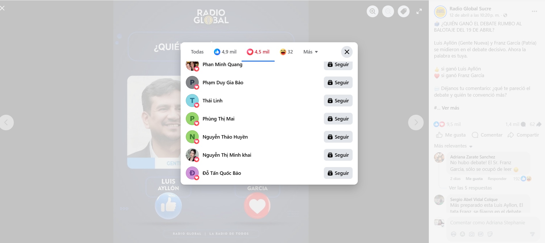 Al revisar las interacciones, que alcanzaron las 9,5 mil reacciones, se observó que existen nombres extraños y escritos en otro idioma. Al revisar la interacción que hubo para el candidato por Patria Unidos (un total de 4.557), se hallaron cuentas con nombres como: Hoang Thu Hieu, Chu Long Phap, Pham Thuc Tai, Truong Hoa Nhung, entre otros. Es decir, nombres asiáticos.