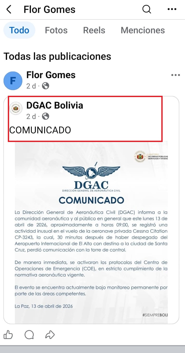 Pero este contenido es falso y fue aclarado por la misma Policía Boliviana, en el que indicaba que era parte de una desinformación y que no se había determinado ningún seguimiento a ninguna exautoridad.