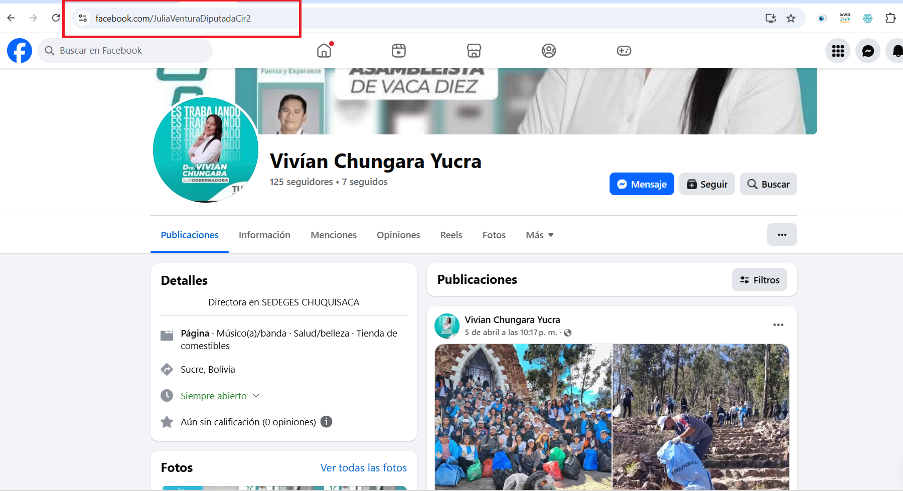 En Facebook, circula un perfil a nombre de Vivian Chungara, exsecretaria de la Gobernación de Chuquisaca y exdirectora del Servicio Departamental de Gestión Social (SEDEGES), mediante el cual se difunden contenidos en apoyo al candidato de la Alianza Gente Nueva, Luis Ayllon. Sin embargo, se constató que esta información es falsa, ya que se trata de una cuenta que suplanta la identidad de la exautoridad y no corresponde a su perfil oficial.
