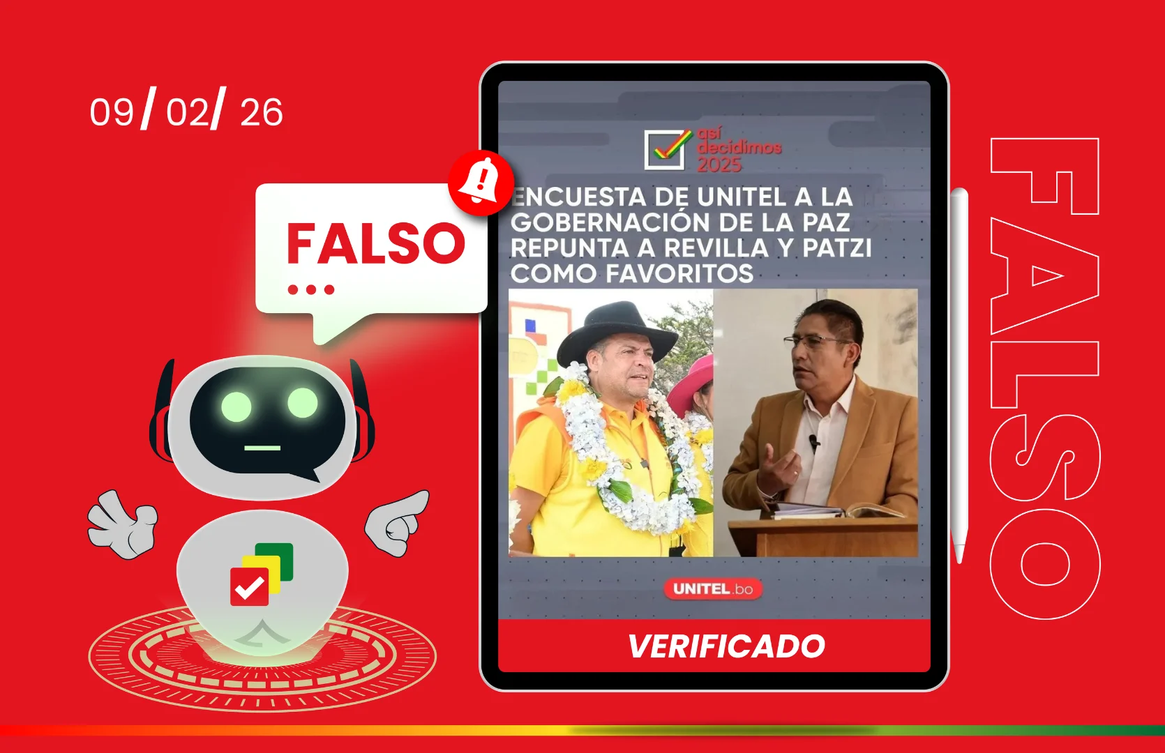 Gobernación de La Paz: Unitel no publicó una encuesta que sitúa a Revilla y Patzi líderes en intención de voto https://boliviaverificaelecciones.bo/gobernacion-de-la-paz-unitel-no-publico-una-encuesta-que-situa-a-revilla-y-patzi-lideres-en-intencion-de-voto/ Mon, 09 Feb 2026 17:27:46 +0000 https://boliviaverificaelecciones.bo/?p=13624 El medio de comunicación confirmó que no difundió la imagen ni realizó ninguna encuesta. En Facebook, la página Bolivia es mi vida compartió una imagen con la línea gráfica del medio Unitel en la que se afirma que, según una encuesta atribuida a ese medio, Luis Revilla y Félix Patzi figuran como favoritos en la […]
