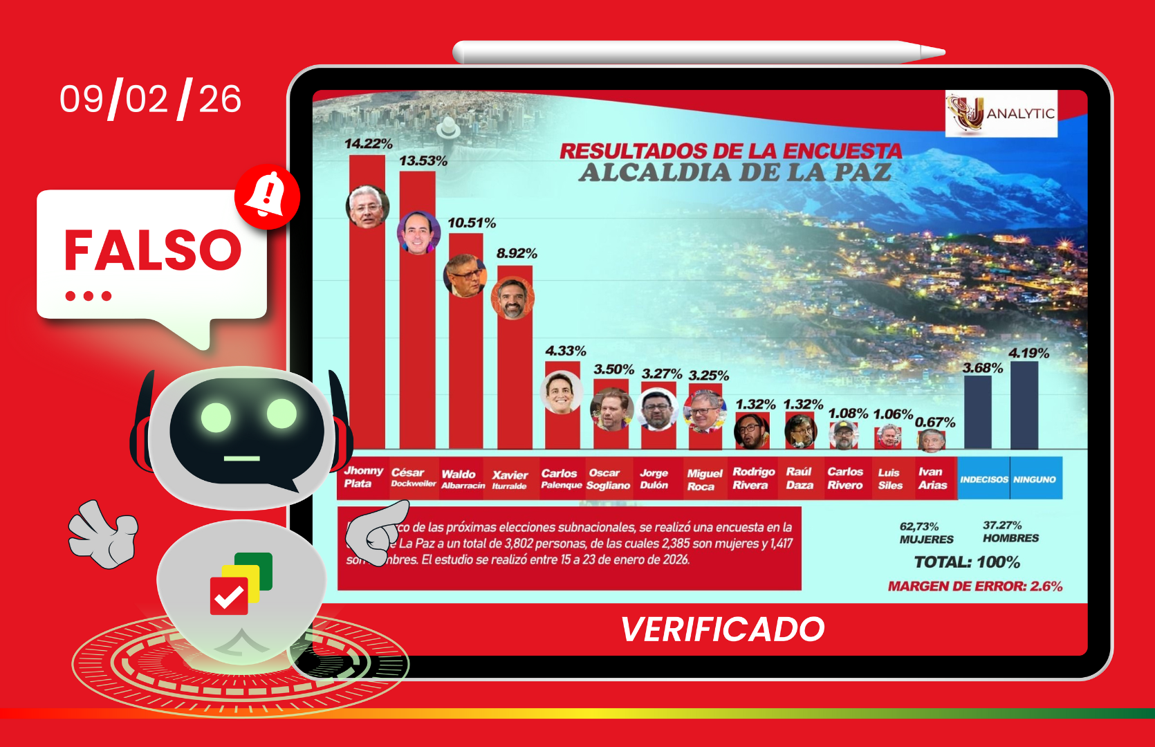 Falso: Circula encuesta inexistente sobre la intención de voto en la ciudad La Paz https://boliviaverificaelecciones.bo/falso-circula-encuesta-inexistente-sobre-la-intencion-de-voto-en-la-ciudad-la-paz/ Mon, 09 Feb 2026 21:47:57 +0000 https://boliviaverificaelecciones.bo/?p=13500 El contenido presenta inconsistencias en los porcentajes y no da la evidencia técnica exigida por el TSE para avalar el estudio.