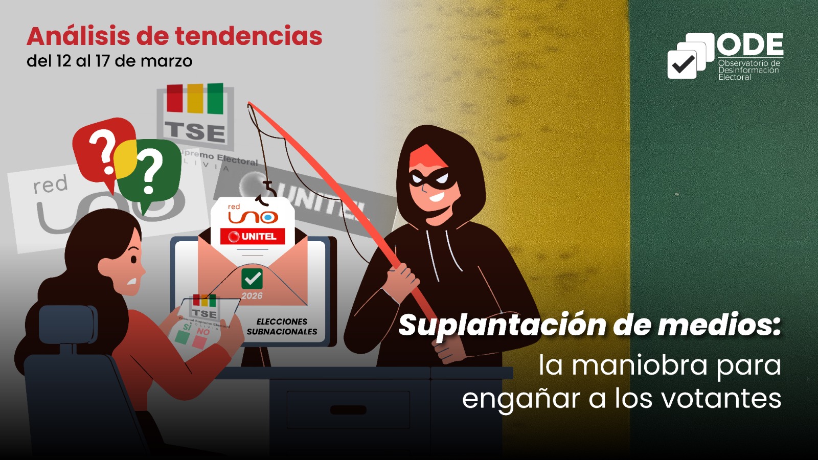 El Observatorio de Desinformación Electoral (ODE) de Bolivia Verifica, luego de un riguroso proceso, identificó que medios importantes con cobertura nacional están siendo suplantados para generar contenidos manipulados, debido a la facilidad del reconocimiento de su línea corporativa. De los 10 contenidos virales verificados en la semana, 9 resultaron falsos y 1 engañoso.