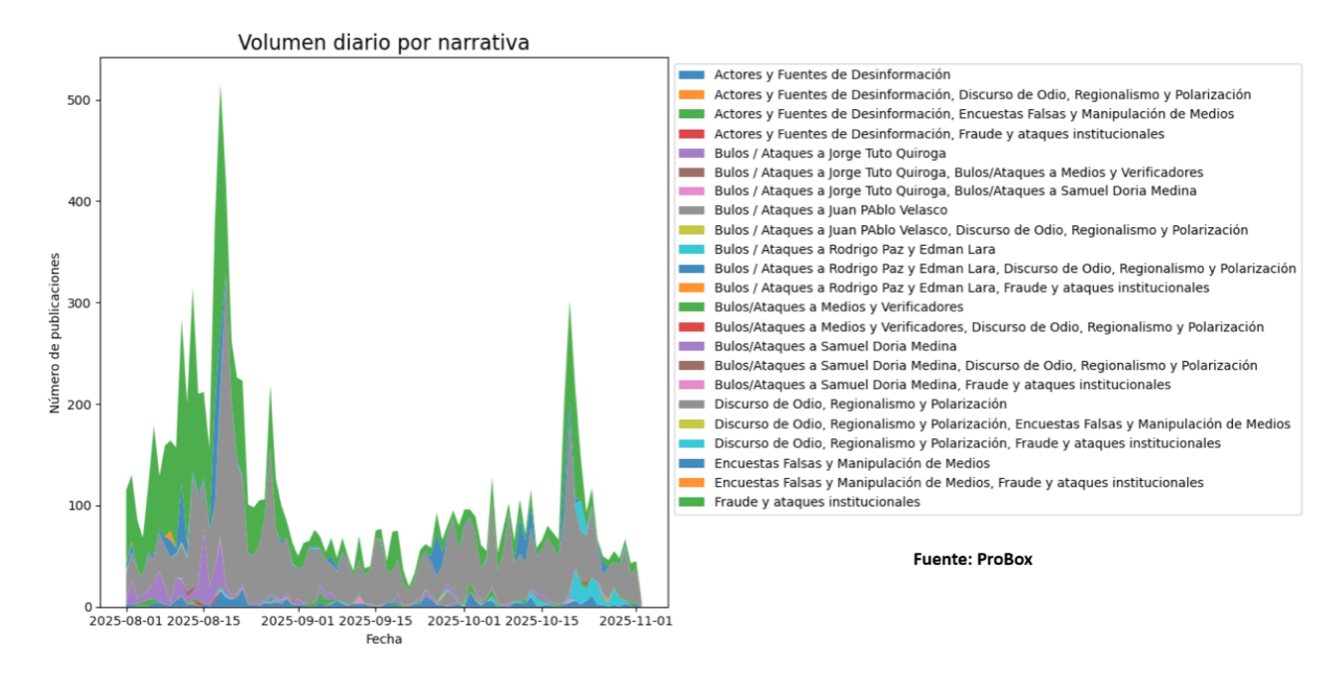 - 18 de agosto: ProBox registró el pico más alto de conversación digital, con 516 menciones dominadas por acusaciones de fraude y ataques al TSE.