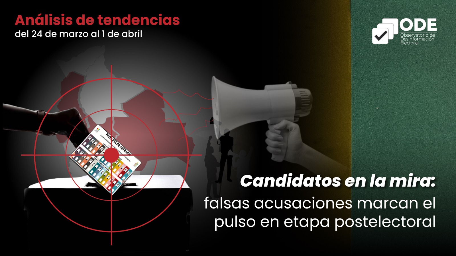 Durante todo el proceso, se activaron diferentes estrategias que buscaron influir en las urnas, en medio de un escenario complejo por la cantidad de contendientes. Según el monitoreo del Observatorio de Desinformación Electoral (ODE) de Bolivia Verifica, muchas de ellas se mantienen para sembrar incertidumbre por los resultados, establecer relaciones negativas sobre algunos candidatos y afectar su imagen. Por tanto, las falsas acusaciones marcan la tendencia de desinformación durante la primera semana de abril.