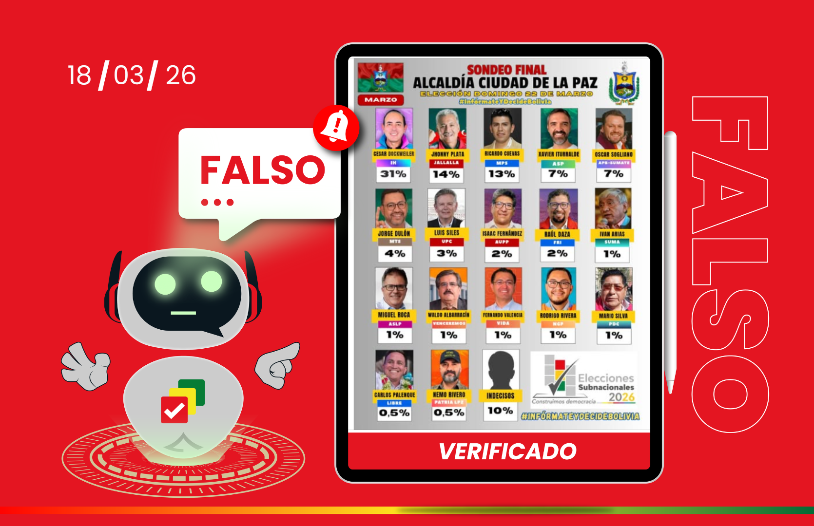 El contenido difundido como “sondeo final” sobre la Alcaldía de La Paz no cuenta con respaldo metodológico ni cumple con los requisitos establecidos para la difusión de encuestas electorales en Bolivia. Además, el uso de imagen institucional del proceso electoral puede generar confusión sobre su origen y validez.