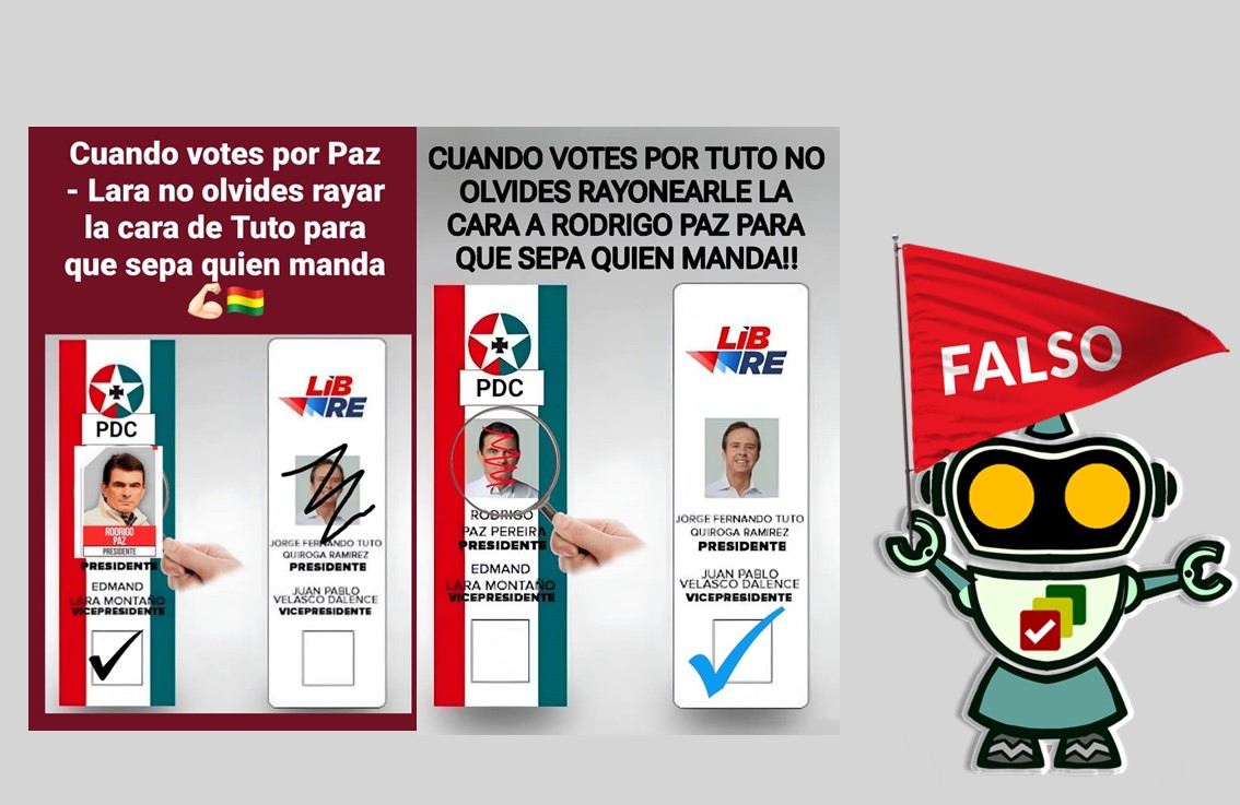 A pocas horas de la segunda vuelta, circulan por WhatsApp dos imágenes y por TikTok videos (1 y 2) que incitan a marcar la boleta electoral de manera que el voto termine anulado. La finalidad es afectar a los dos binomios que van el balotaje. Por lo tanto, se trata de contenido falso que no debe ser compartido.