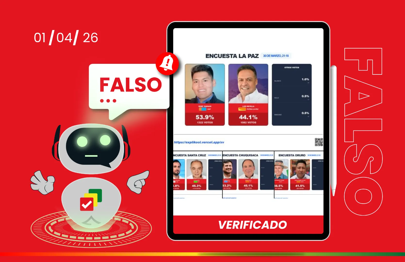 En Facebook circulan resultados de encuestas sobre la segunda vuelta en las gobernaciones de La Paz, Santa Cruz, Chuquisaca, Beni, Tarija y Oruro. Sin embargo, estas publicaciones no tienen autorización del Tribunal Supremo Electoral (TSE).