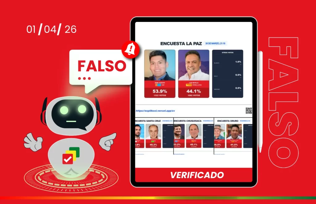 El portal solicita nombre completo, carnet de identidad y número de teléfono para participar, pero no tiene respaldo institucional y carece de fiabilidad.ContentsAnálisis de la páginaDatos de la páginaElementos que pueden generar confusiónNo cuenta con respaldo oficialConclusión Redacción: Aaron Carrasco En Facebook circulan resultados de encuestas sobre la segunda vuelta en las gobernaciones de La … Sigue leyendo Circulan sin aval del TSE encuestas sobre la segunda vuelta electoral en Facebook