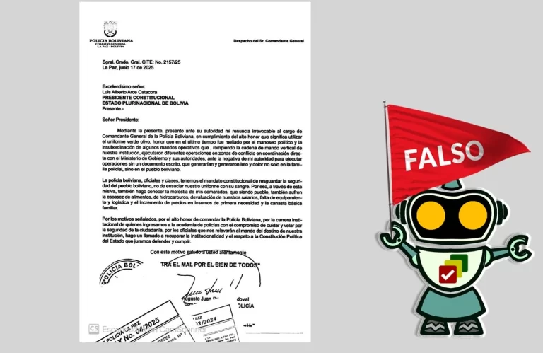 A través de una entrevista radial, el jefe policial desmintió la carta que circula a su nombre. Esta desinformación circula en un contexto de alta tensión político-electoral. La tarde de este martes 17 de junio, se difundió la información de que el comandante general de la Policía Boliviana Augusto Russo renunció a su cargo, y … Sigue leyendo El Comandante General de la Policía no renunció a su cargo