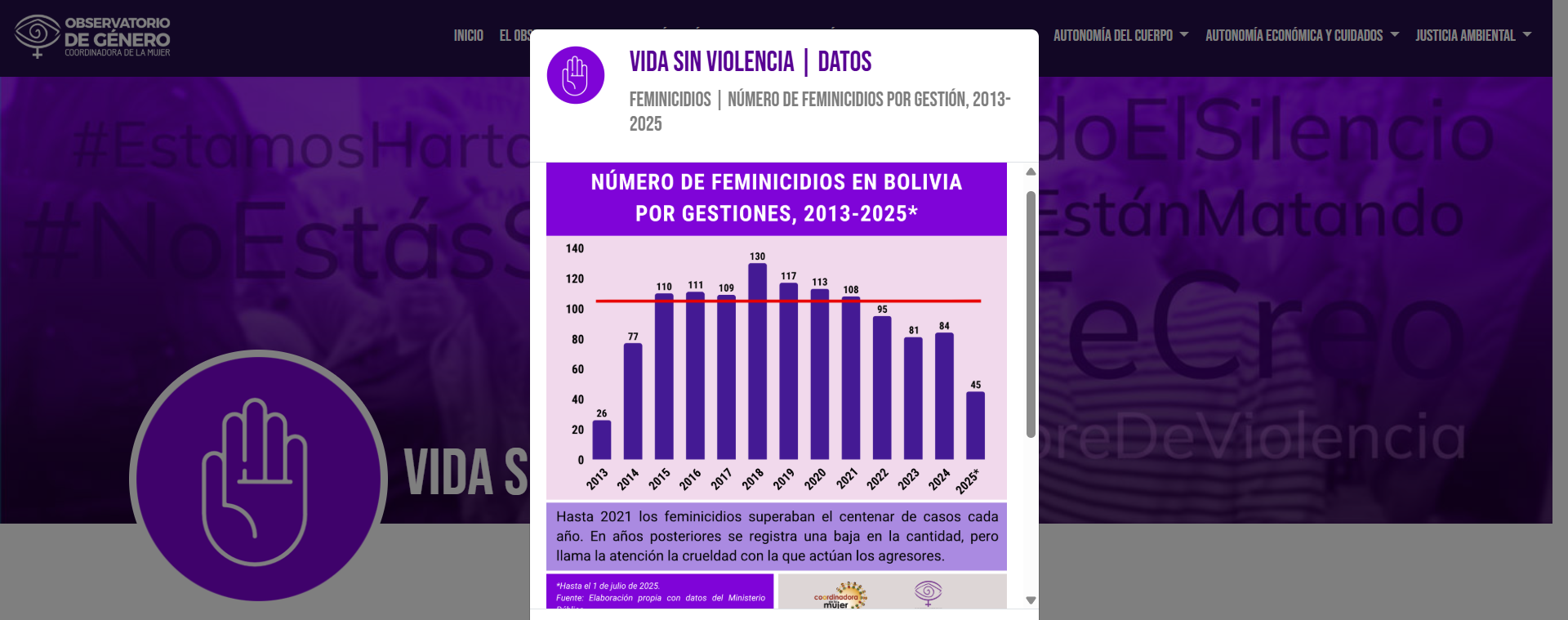 Por su parte, la información oficial del Ministerio Público en su sitio web muestra datos muy similares: https://www.fiscalia.gob.bo/estadisticas/feminicidios?page=2
