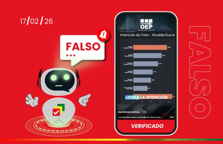 En redes sociales circula una imagen que atribuye resultados a favor de Cristian Sanabria y Jeyson Auza. Este sondeo es falso. ContentsContexto de desinformaciónNo, el OEP no la publicó A través del monitoreo en TikTok, se identificó una imagen que posiciona a Cristian Sanabria de Fuerza con el 19% de preferencia, seguido por Jeyson Auza de la … Sigue leyendo El OEP no realizó ni difundió esta encuesta de intención de voto para la Alcaldía de Sucre