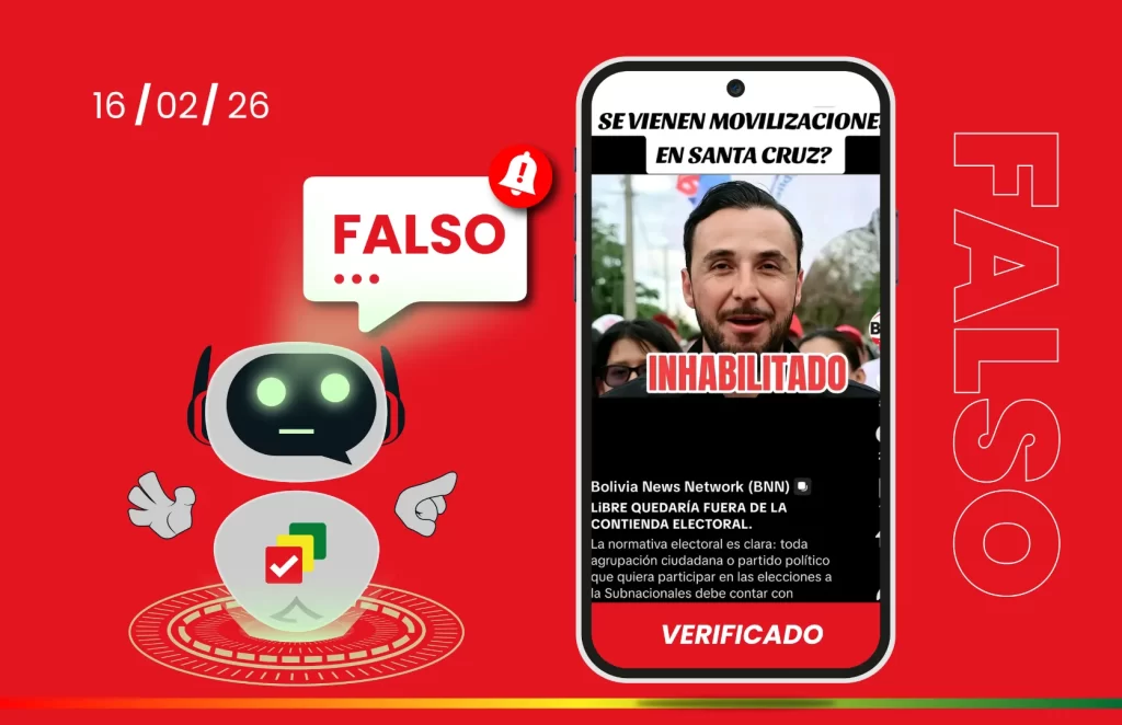La publicación no muestra ninguna resolución electoral y contradice el registro oficial de candidaturas.ContentsBúsqueda de informaciónLista de candidatos habilitadosContexto electoral A través de TikTok, la cuenta Bolivia News Network (BNN) difundió una imagen del candidato a la gobernación de Santa Cruz, Juan Pablo Velasco, acompañada de un texto que afirma que fue inhabilitado para participar … Sigue leyendo Elecciones Subnacionales 2026: el Tribunal Supremo Electoral no inhabilitó a Juan Pablo Velasco