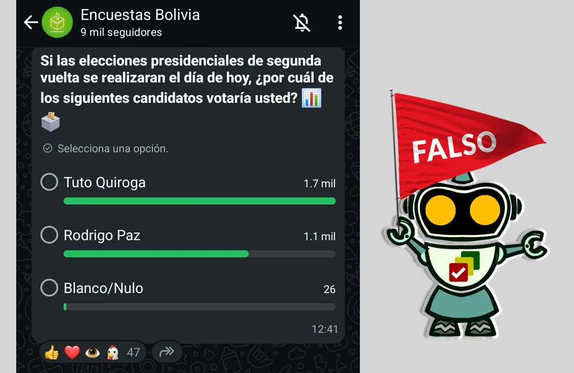 Mediante de un canal de WhatsApp se difunde una encuesta de intención de voto que favorece al candidato presidencial Jorge Tuto Quiroga, de la Alianza Libre. El canal cuenta con más de 9.000 seguidores; sin embargo, esta encuesta se considera falsa, ya que no está regulada ni autorizada por el Tribunal Supremo Electoral (TSE) y carece de una ficha técnica.