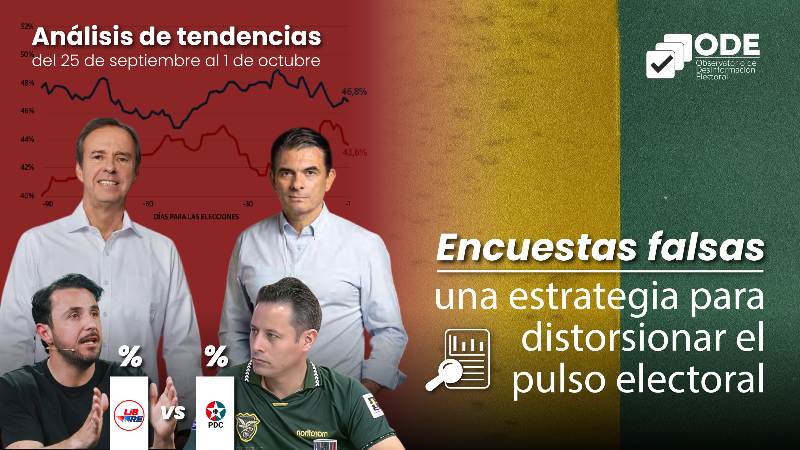 El Observatorio de Desinformación Electoral (ODE) de Bolivia Verifica, luego de un riguroso proceso de verificación, identificó como tendencia de la última semana de septiembre, cómo las cuentas que generan desinformación aprovechan la intensificación de las campañas políticas y los ataques entre binomios, para difundir sondeos falsos que buscan posicionar a un determinado candidato como favorito.