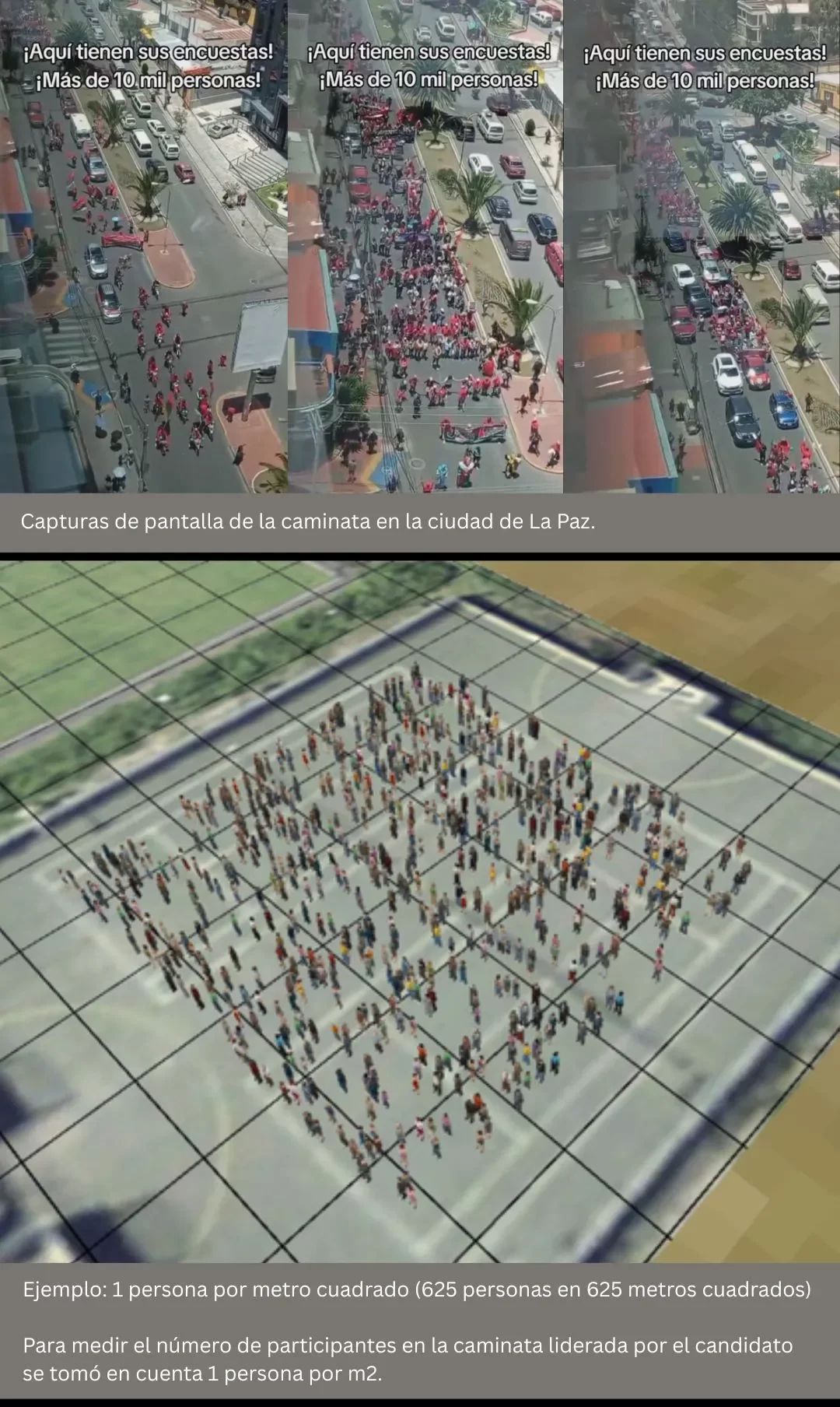 En el video se observa que la marcha se extiende aproximadamente entre las calles 13 y 20 de la avenida Ballivián, de la zona de Calacoto de la ciudad de La Paz. También se identifican espacios vacíos entre los asistentes y sectores ocupados por vehículos. Por ello, se hizo la estimación tomando en cuenta a una persona por metro cuadrado,