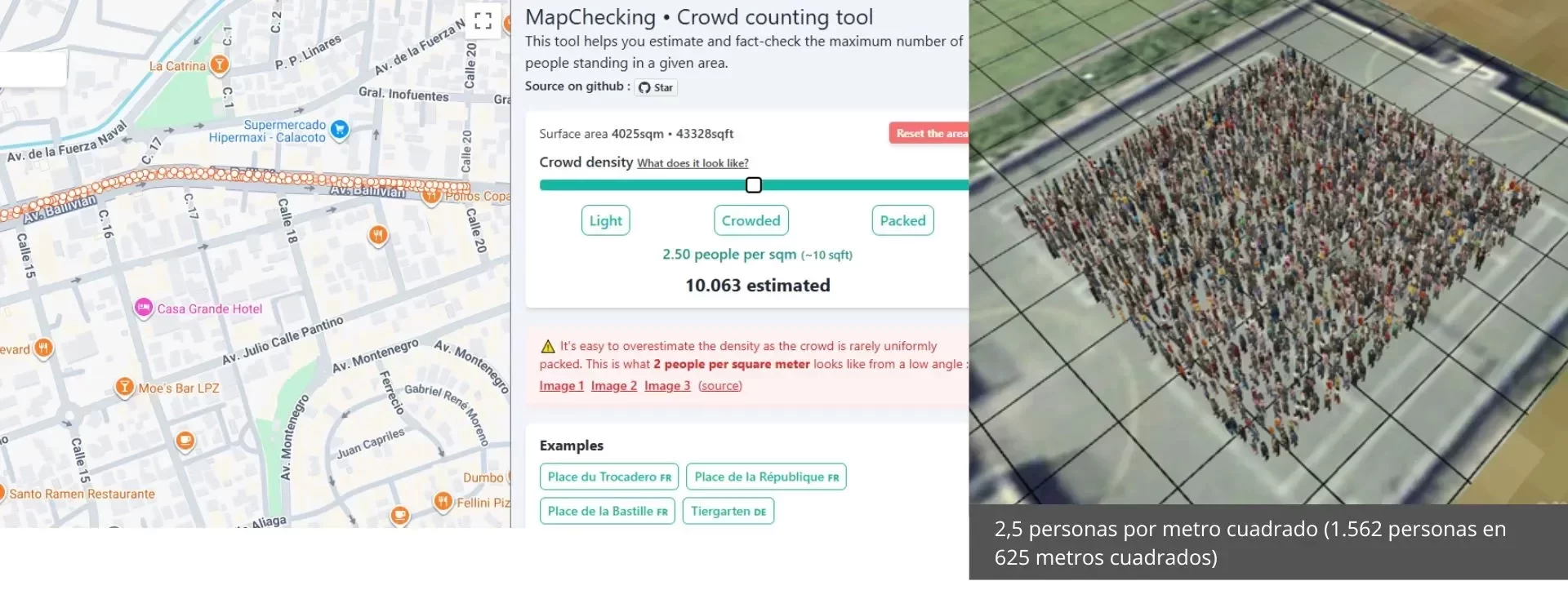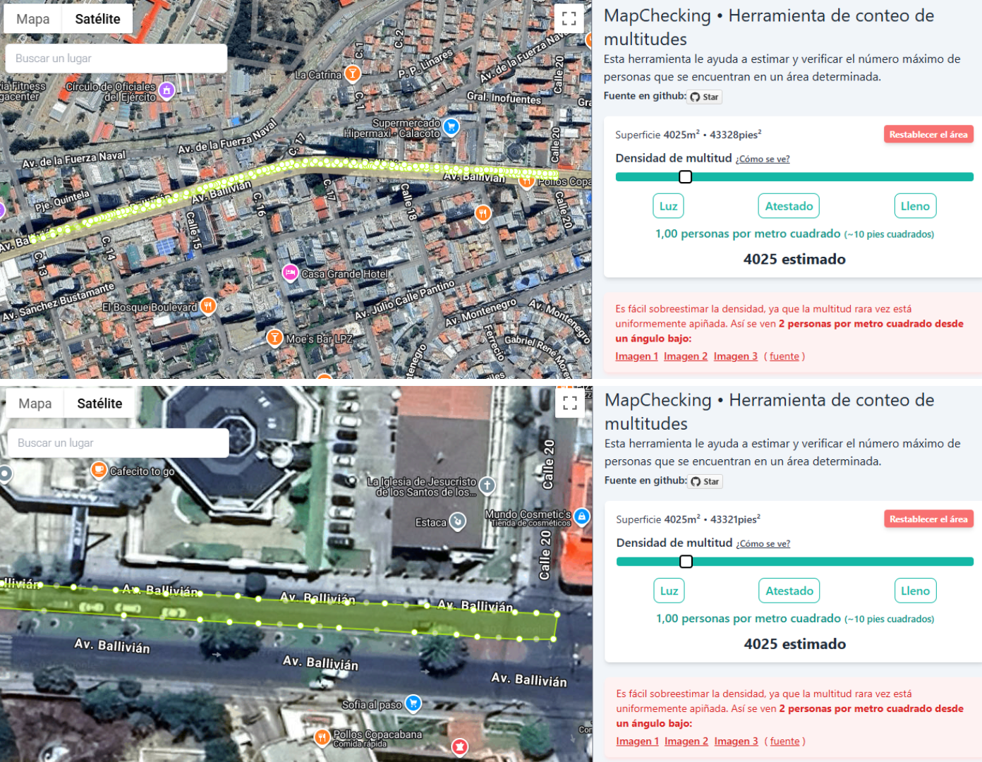 La herramienta de conteo de multitudes MapChecking explica que para estimar la cantidad de personas en concentraciones públicas, se debe tomar como referencia la densidad por metro cuadrado. Aclara que en escenarios de alta concentración pueden ubicarse entre cuatro y seis personas por metro cuadrado y en concentraciones medias o con espacios visibles, la densidad es menor.