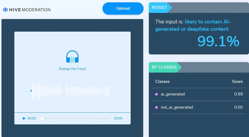 - Hive Moderation determinó que el audio tiene un 99,1% de probabilidad de haber sido generado con inteligencia artificial.