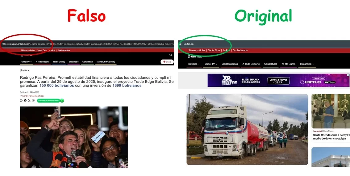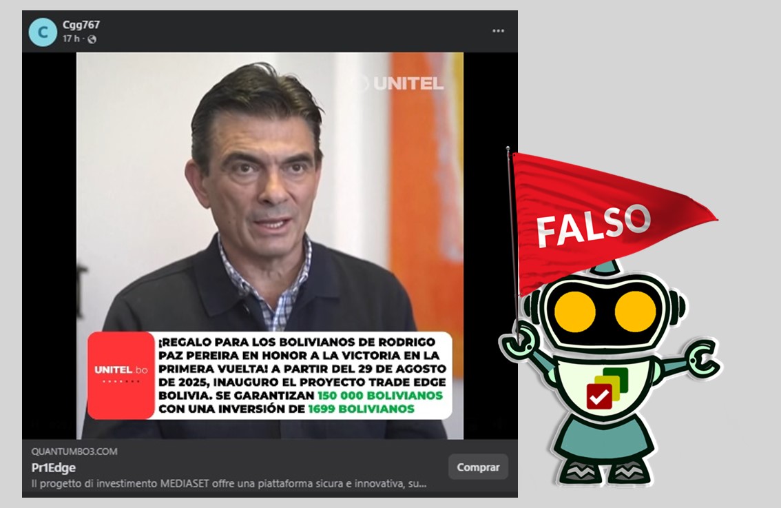 Por Facebook se expande un video en el que se observa al candidato a la presidencia por el Partido Demócrata Cristiano (PDC) Rodrigo Paz Pereira, quien ofrece a los bolivianos un proyecto de «inversión» como regalo por su triunfo electoral del 17 de agosto. Este material es completamente falso, ya que el clip fue creado artificialmente y utiliza de manera fraudulenta el nombre del medio de comunicación Unitel y del aspirante a la silla presidencial para engañar a los usuarios.