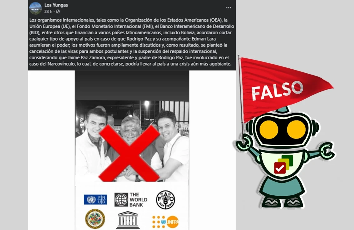 En Facebook se difunde una publicación que afirma que la OEA, la Unión Europea, el FMI, el BID y otros organismos internacionales habrían acordado suspender todo tipo de apoyo a Bolivia en caso de que Rodrigo Paz y Edmand Lara asuman el poder, además de cancelar las visas de ambos candidatos. Sin embargo, esta información es falsa.
