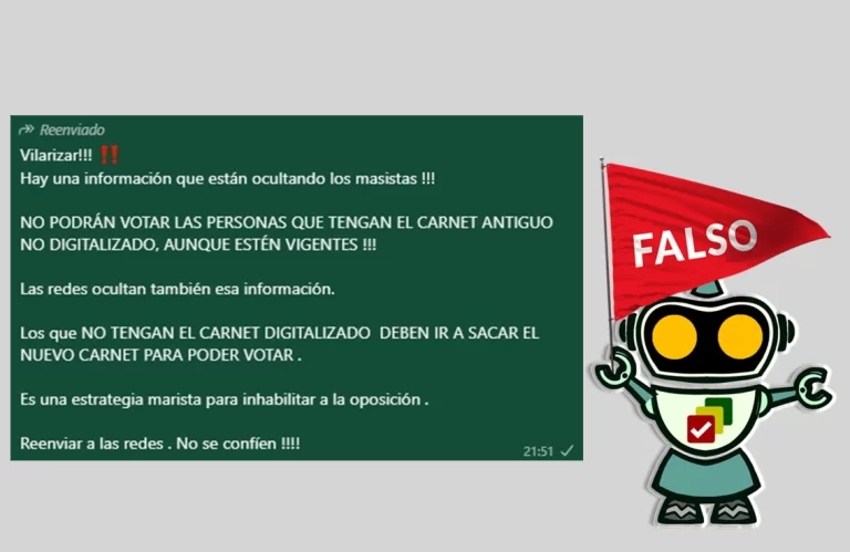 El reglamento aprobado por el TSE para las Elecciones Generales 2025 establece que las y los ciudadanos podrán sufragar presentando su cédula de identidad en formato físico o digital. En grupos de WhatsApp circula un mensajes alarmista en sentido de que los electores solo podrán votar si cuentan con la cédula de identidad digitalizada. Sin … Sigue leyendo Es falso que se deba presentar el carnet digitalizado para votar en las elecciones del 17 de agosto