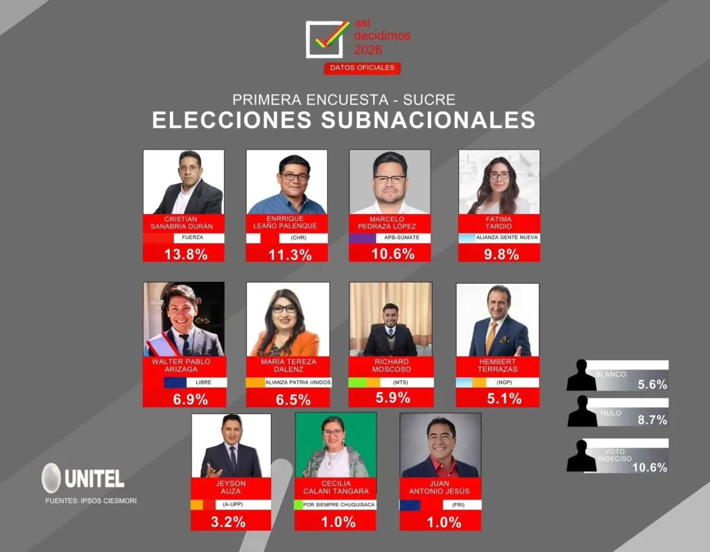 Una publicación difundida por la página de Facebook Trabajos Sucre – Bolivia afirma que la red Unitel presentó la primera encuesta electoral rumbo a la Alcaldía de Sucre, citando como fuente a este medio televisivo y a la empresa Cismori.