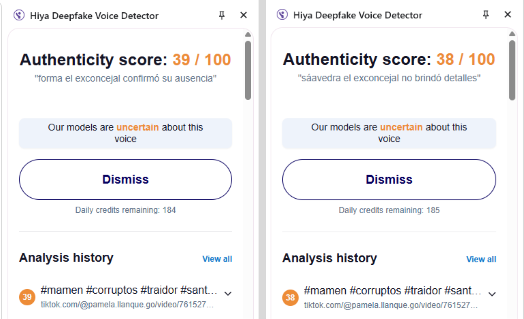 Asimismo, el audio fue analizado con la herramienta Hiya Deepfake Voice Detector, utilizada para detectar posibles voces generadas mediante inteligencia artificial.