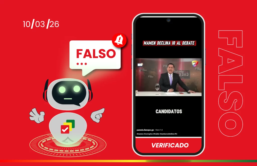 El contenido simula un hecho noticioso, utiliza imágenes de archivo y presenta indicios de manipulación en el audio. Además, el propio candidato confirmó ante medios que participará en espacios de debate con distintos sectores de la ciudad.ContentsAnálisis del videoEl audio presenta señales de manipulaciónNo existen registros del supuesto anuncioEl candidato sí participa del debate del … Sigue leyendo Es falso: video afirma que «Mamén» Saavedra declinó asistir al debate convocado por el Tribunal Electoral