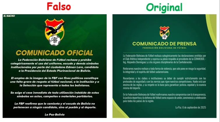 • En la imagen falsa, se incluye el logo de la FBF en el fondo; en los comunicados reales, el fondo es liso y tiene bordes en verde claro.