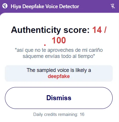 Tras revisar el contenido, se observó que no existe una sincronización completa entre el movimiento de los labios y el audio. Por lo que se aplicó la herramienta Deepfake Voice Detector, que determinó solo un 15% de autenticidad, confirmando que la voz fue generada artificialmente.