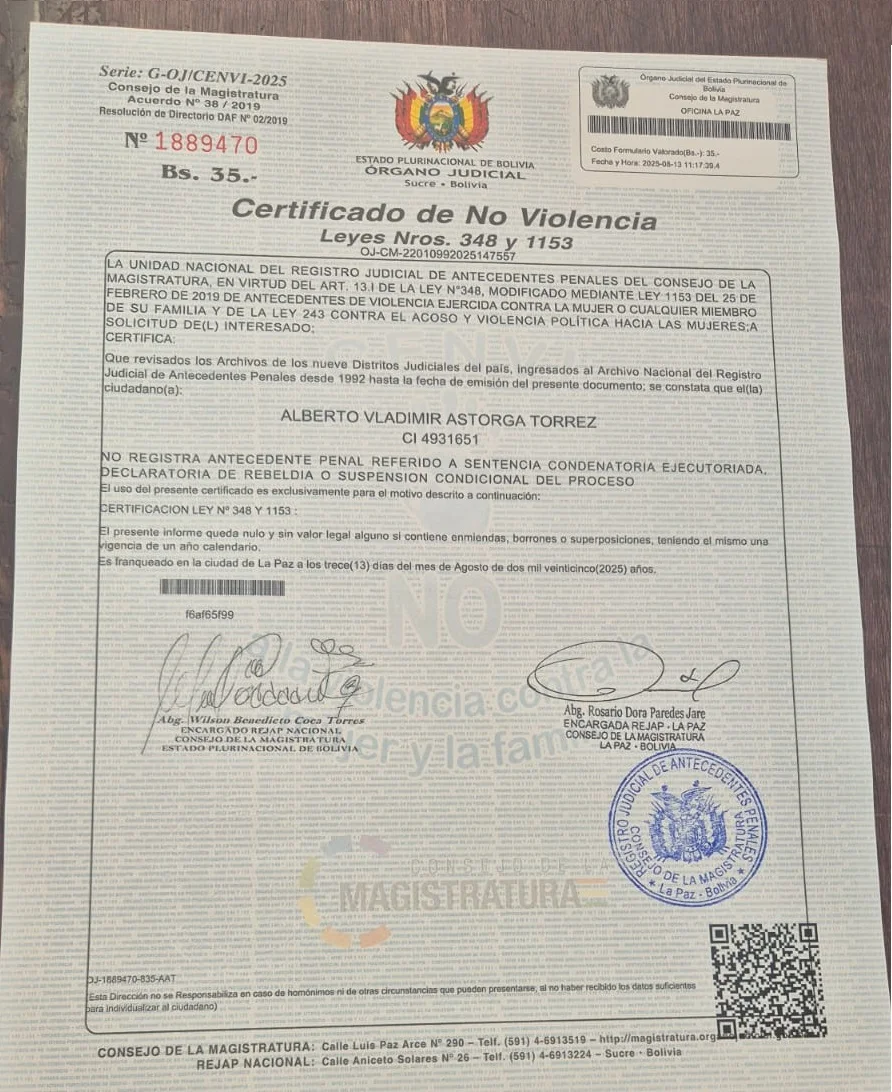 Para verificar estas afirmaciones, Bolivia Verifica realizó una rastreo a profundidad en navegadores y redes sociales sin encontrar evidencia de denuncias por violencia en su contra. Además, el parlamentario facilitó un Certificado de No Violencia del Consejo de la Magistratura, que confirma la ausencia de cualquier antecedente penal por este tipo de delito.