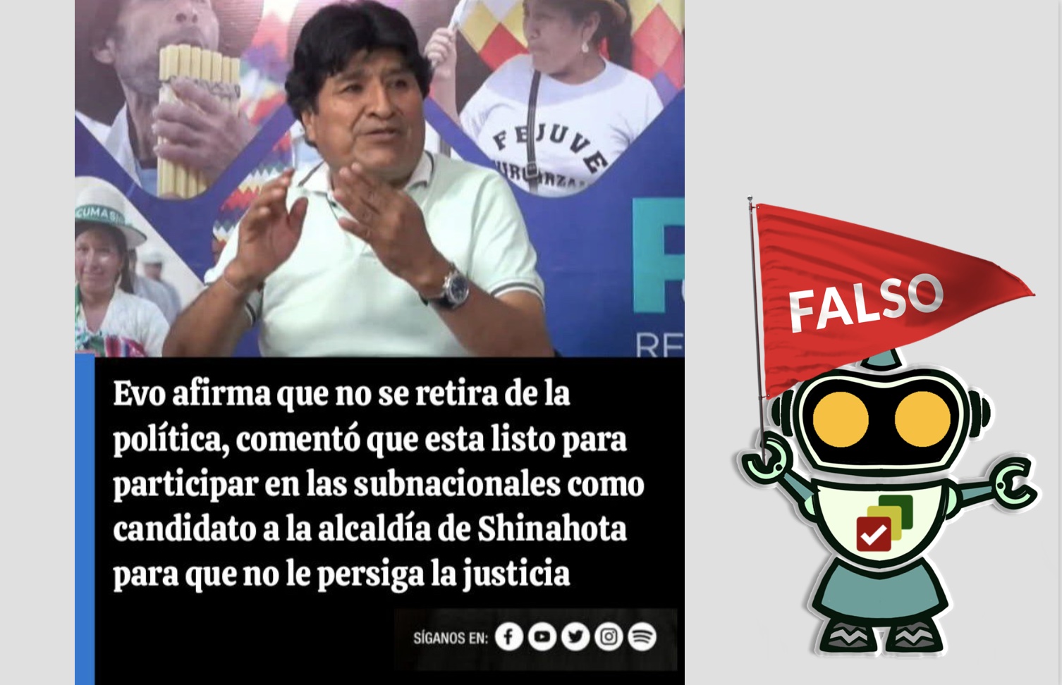 Por la página de Facebook Resistencia Potosina se difunde una imagen con la foto de Evo Morales y un titular que indica que «está listo para participar como candidato a la alcaldía de Shinahota», municipio del departamento Cochabamba. Sin embargo, este dato es falso. Morales no hizo ese anuncio.