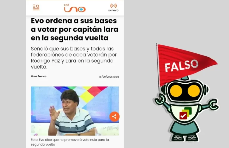 La imagen que circula con el logo de Red Uno fue manipulada digitalmente. El medio confirmó que nunca publicó esa información. En Facebook se publicó una imagen con la línea gráfica de Red Uno en la que se atribuye al expresidente Evo Morales instruir a sus bases votar por el Partido Demócrata Cristiano (PDC). Sin … Sigue leyendo Evo Morales no ordenó a sus bases votar por Edmand Lara