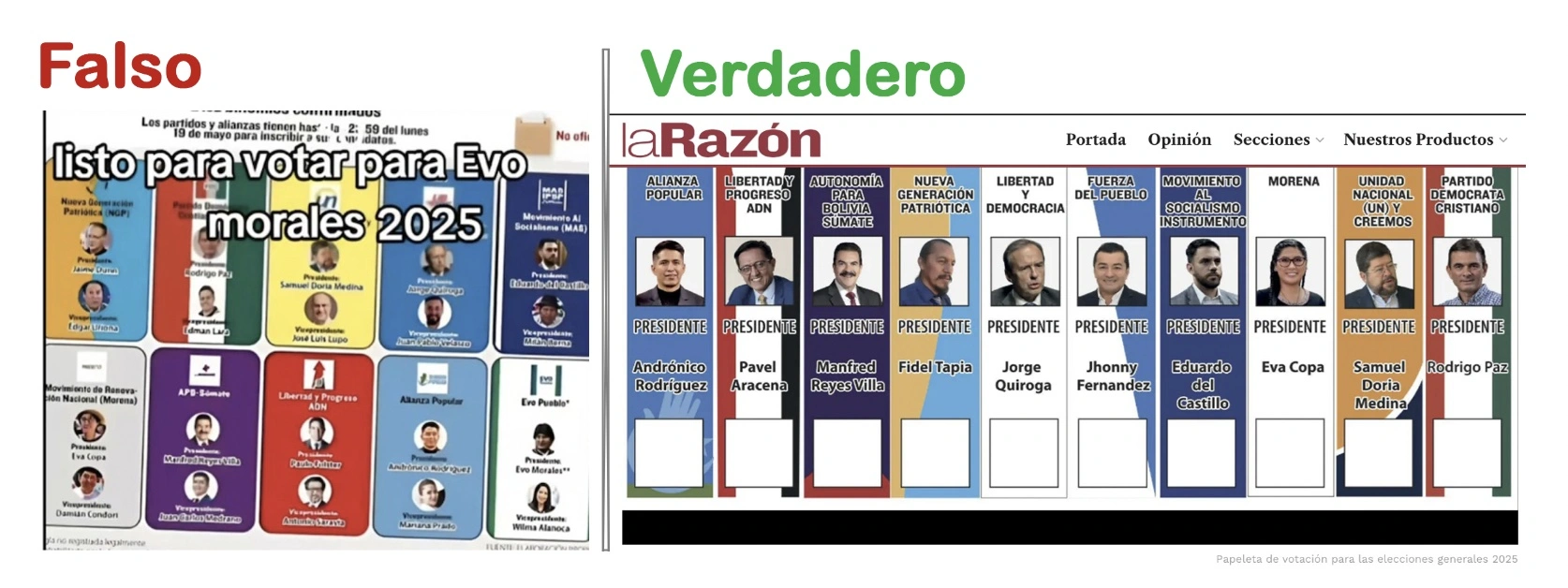 La contenido muestra la imagen de una papeleta de sufragio en dos filas. En la última ubicación (10) se encuentra Evo Pueblo con las fotos de Evo Morales, como candidato a la presidencia, y Wilma Alanoca, a la vicepresidencia. Y en un costado se ve el logo del periódico La Razón.