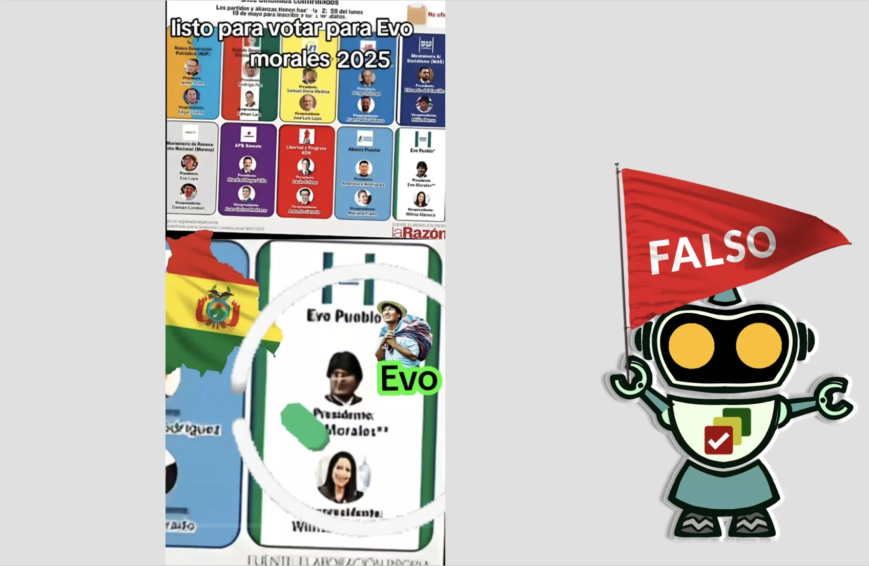 Es falso el video que muestra a la sigla de Evo Pueblo con Evo Morales y Wilma Alanoca en la papeleta de sufragio, a 55 días de los comicios presidenciales del 17 de agosto. La organización política Evo Pueblo no cuenta con personería jurídica ni ha logrado conformar una alianza política que le permita participar en las Elecciones Generales.