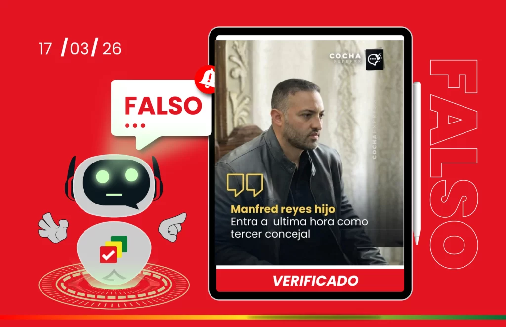 La publicación difundida en redes sociales es falsa. Manfred Reyes Villa Avilés no está inscrito como candidato a concejal en las elecciones subnacionales 2026; el medio citado no publicó ese contenido y la imagen utiliza una fotografía fuera de contexto para reforzar una afirmación sin respaldo.