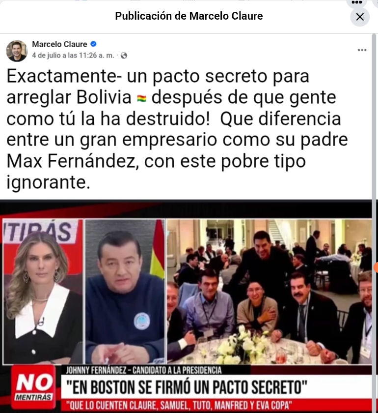 En la ronda de preguntas y respuestas en el Debate Presidencial 2025, el candidato por la Alianza la Fuerza del Pueblo Jhonny Fernández volvió a mencionar que existe un acuerdo oculto entre Samuel Doria Medina y el empresario Marcelo Claure y que este lo hizo público en sus redes sociales. No obstante, no se halló evidencia ni registro al respecto, por lo que el discurso de Fernández es falso.