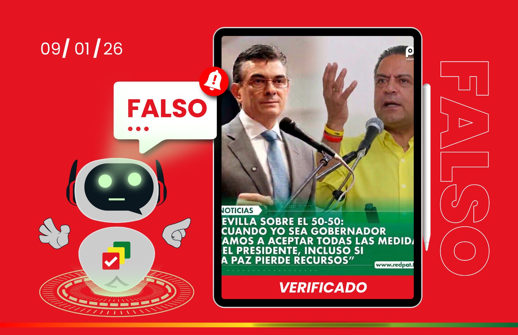 La publicación viral presenta una imagen que simula ser una noticia de PAT. En la fotografía aparecen Revilla y el presidente Rodrigo Paz Pereira, acompañados por un titular que atribuye al exalcalde una declaración sobre el modelo “50/50” y la aceptación de medidas del presidente incluso si el departamento de La Paz pierde recursos.