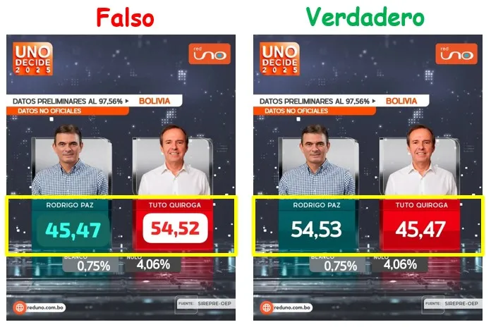 Como se puede observar, la versión manipulada intercambia los porcentajes de los candidatos, para simular una victoria de Quiroga.