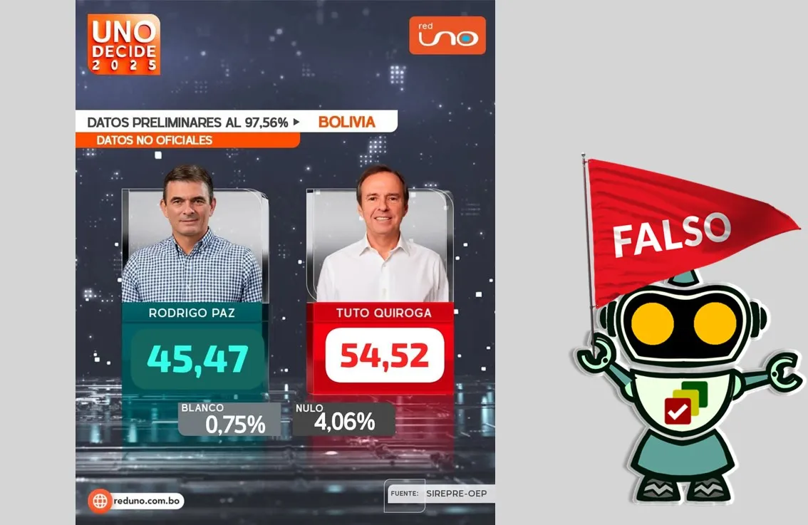 En un grupo de WhatsApp se difundió esta una imagen que lleva la línea gráfica de Red Uno con resultados preliminares de la segunda vuelta electoral, dando como ganador al candidato de Alianza Libre Jorge Tuto Quiroga. No obstante, este contenido es falso.
